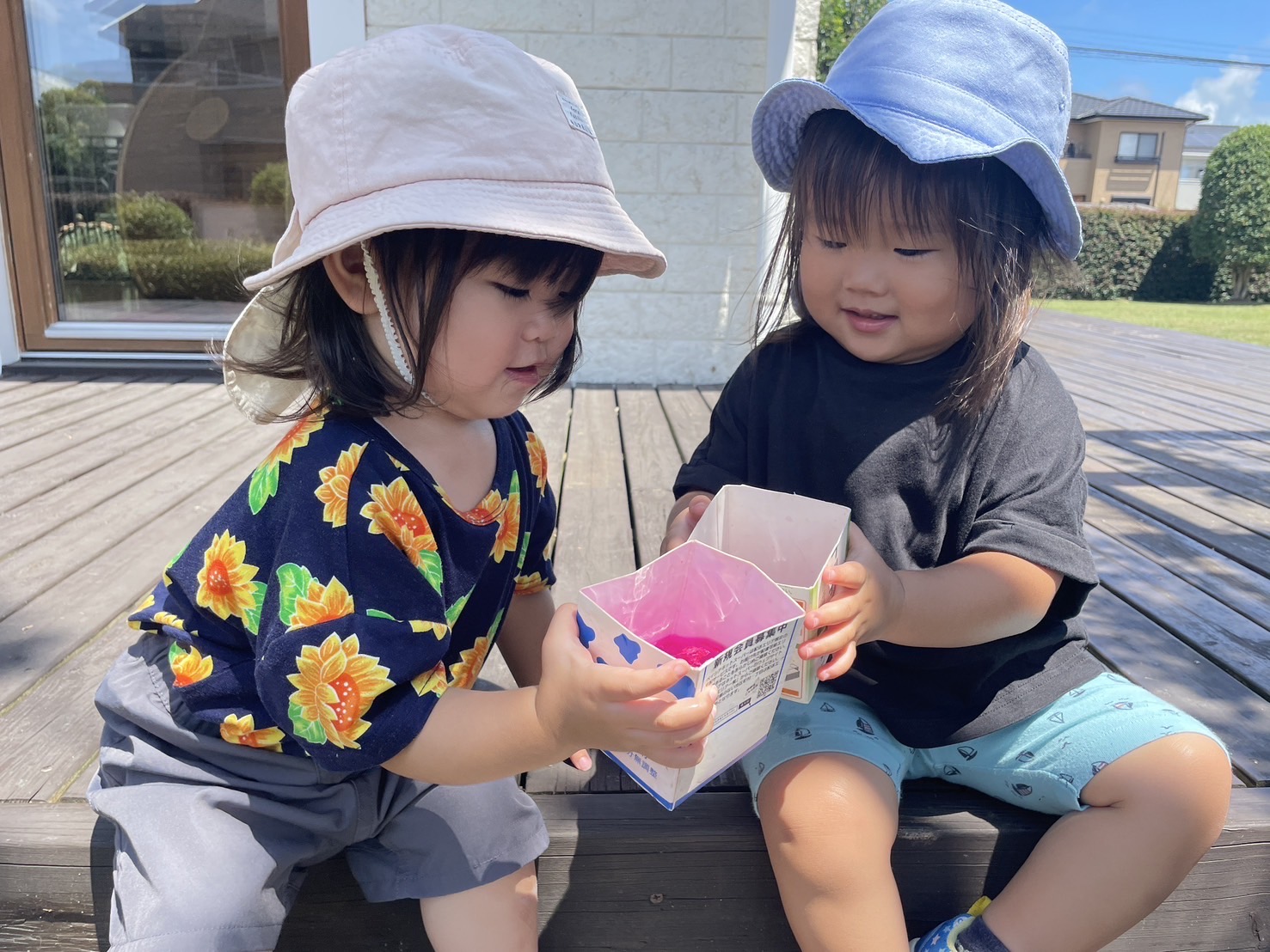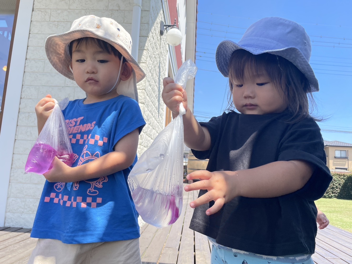 5月に植えたアサガオの種に毎日お水をあげてお世話していたTOMATOクラスの子どもたち。7月に花が咲き、アサガオの花びらを収穫して色水遊びをしたり、その色水を使って滲み絵やジュース屋さんごっこを楽しんだり、今年の夏も暑かったですが、アサガオを通して清涼感あふれる遊びがたくさんできました!
