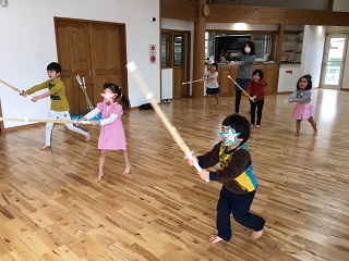おっきなARINKOMURAでは、先日から竹刀を持って、剣道の素振りを始めました。