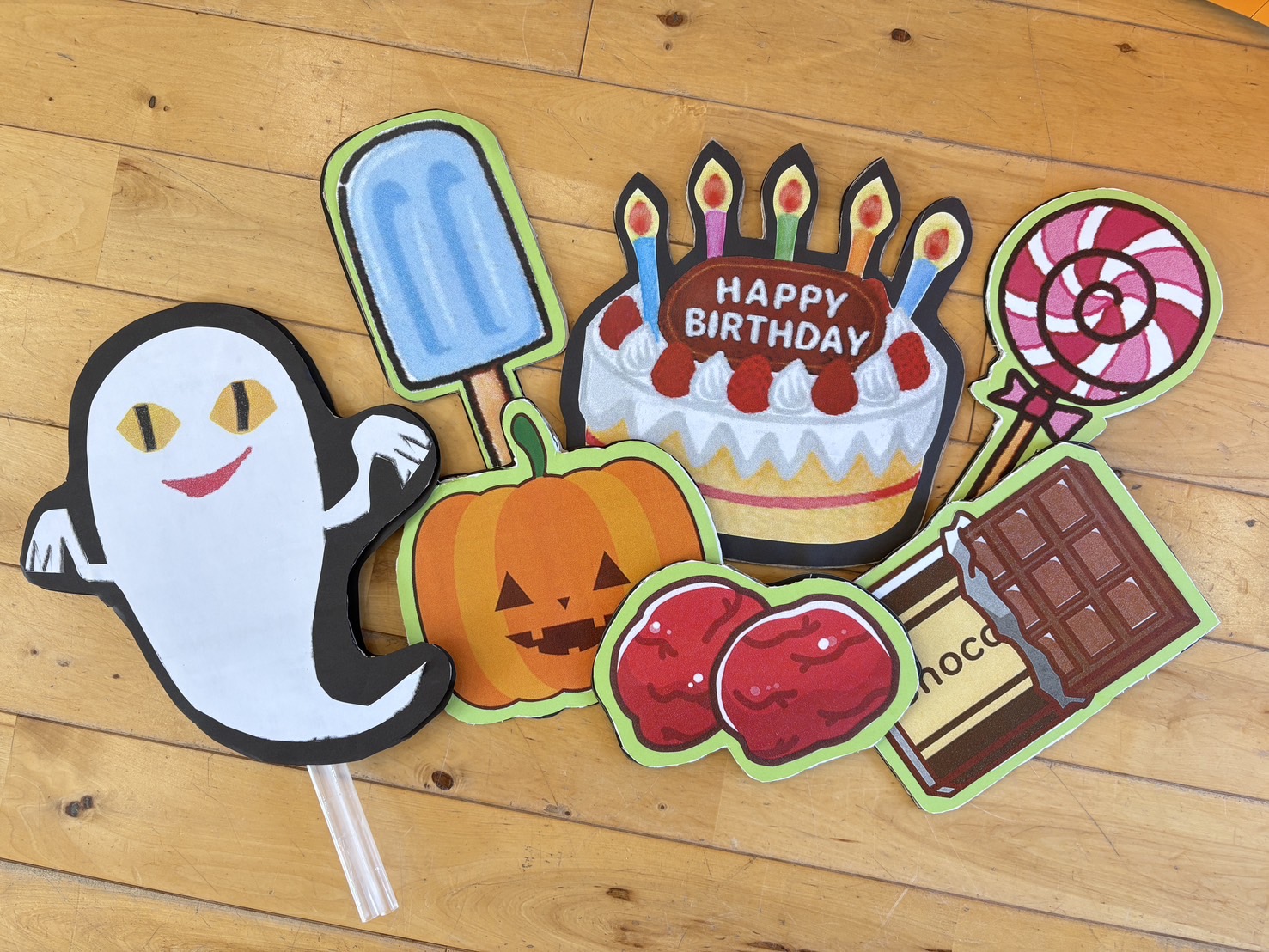 おばけの子~♪」と、みんなで歌っていると…くいしんぼうのおばけちゃんが登場!!くいしんぼうのおばけちゃんが冷蔵庫を開けて見つけたものは…。シルエットの食べ物はなんだろう~?と楽しそうに考えていた子どもたち😊おばけちゃんがまず見つけたのは酸っぱいもの!?「レモンーー!!」みんなで大きな声で答えたけれど、なんと正解は梅干し。シルエットって難しい。キャンディやアイスはみんな大正解。正解すると「やったー!」と、とってもいい笑顔で大喜びでした!