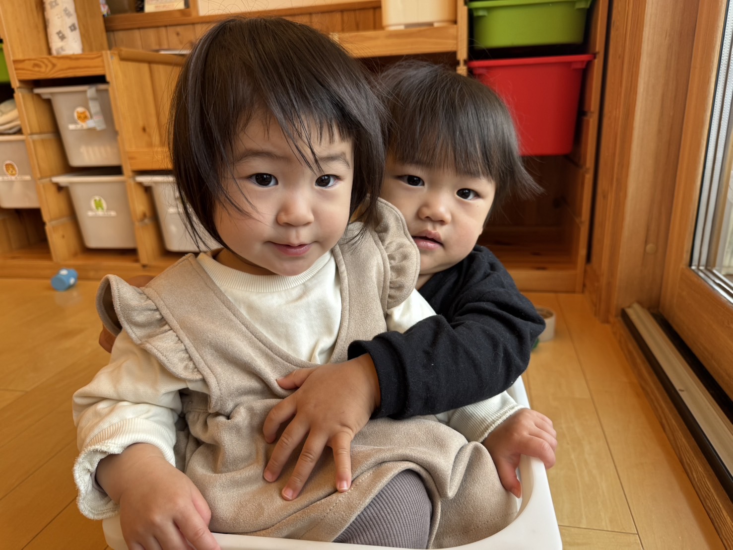 二人で一緒におもちゃを入れる箱に入ってみたり♡